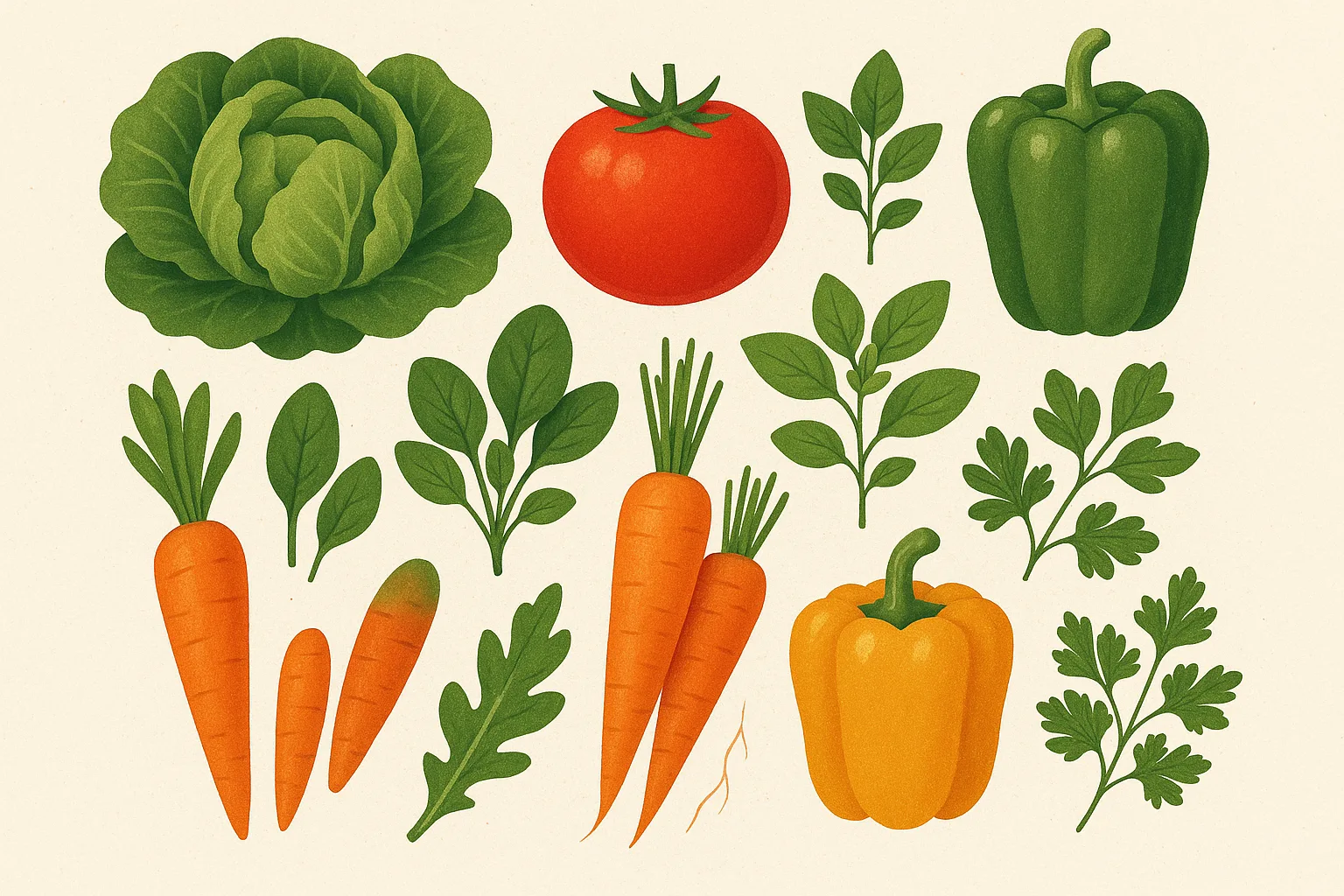 Leafy greens, tomatoes, beans, peppers, and herbs thrive. Root crops like carrots prefer cooler months.